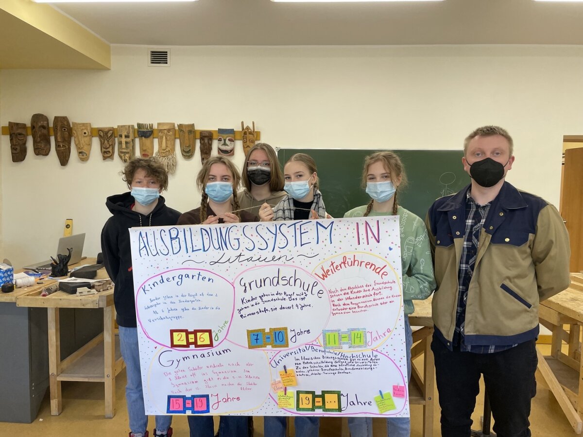 Vilniaus r. Nemenčinės Gedimino gimnazijos IG klasės mokiniai, besimokantys vokiečių kalbos, dalyvauja Erasmus+ projekte „Projekt Schule – Beruf“. Vykdant šį projektą buvo numatyta technologijų dalyko ir profesinio ugdymo integracija, todėl suplanuotas apsilankymas UAB ,,Nemenčinės mediena“. Prieš apsilankymą šioje darbovietėje projekto dalyviai vokiečių kalba paruošė informaciją apie švietimo sistemą Lietuvoje. Darbo rezultatas – mokinių rankomis pagamintas ir įrėmintas plakatas. Visi – ir berniukai, ir mergaitės – mokėsi išmatuoti tinkamą dydį, pjauti medieną, kalti vinį.