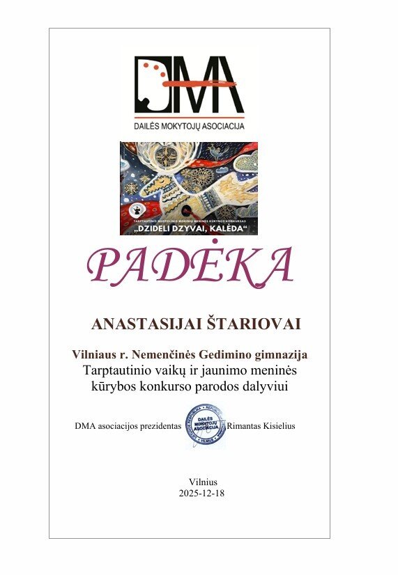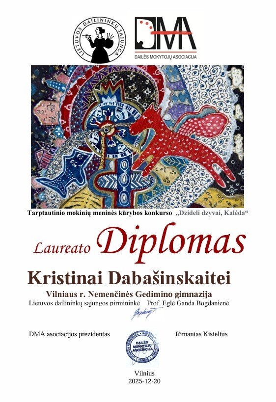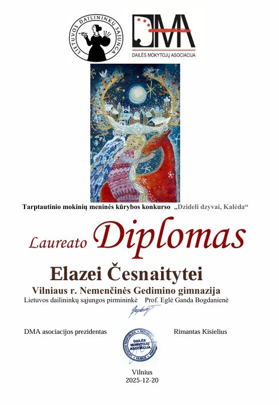 Konkurse dalyvavo ir Vilniaus r. Nemenčinės Gedimino gimnazijos mokinės: IIG klasės mokinė Elzė Česnaitytė, 7b klasės mokinė Kristina Dabašinskaitė ir IbG klasės mokinė Anastasija Štariova. Jų darbuose Kalėdų tema buvo atskleista apgalvotais kompoziciniais sprendimais, nuoseklia vaizdine kalba ir dėmesiu prasmingoms detalėms.