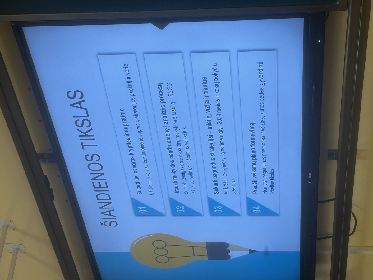 Mokymuose buvo aptarta, kas yra strategija, kokia jos paskirtis ir reikšmė švietimo įstaigos valdyme. Dalyviai dirbo su stiprybių, silpnybių, galimybių ir grėsmių analize, siekdami aiškiau įvertinti gimnazijos vidinę situaciją ir išorinius veiksnius, darančius įtaką mokyklos raidai.