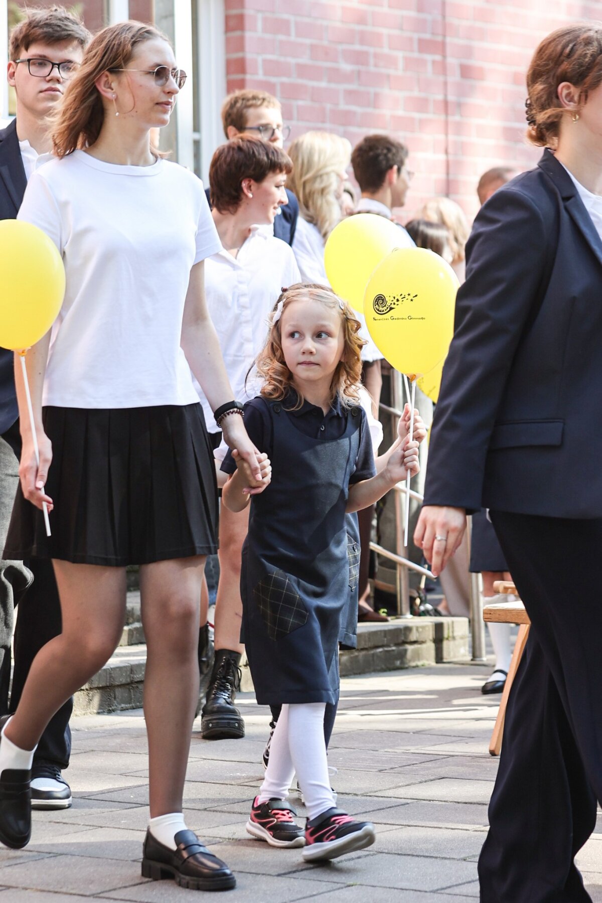 Šventė prasidėjo spalvinga ir simboline eisena: skambant gimnazijos himnui, auklėtojų lydimi abiturientai atvedė į mokyklą 60 pirmokų. Mažiesiems tai buvo pirmoji pažintis su mokykla, o dvyliktokams – paskutinis Rugsėjo pirmosios skambutis gimnazijoje.